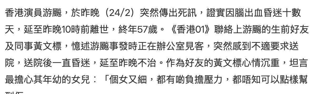 TVB的资深配角游飚突然传出过世的消息,游飚的好友、同样是香港老牌艺人的黄文標证实,他在2月24日晚10点前离开了人世,享年57岁。据黄文標说,游飚在2月12日那天,就开始觉得身体不适,他还找他帮忙叫了救护车,可惜还没等到救护车来,游飚就已经快晕过去了。送到医院一检查,发现是脑出血,从那以后一直昏迷,没有再醒过来,熬到2月24日,就离开了这个世界。